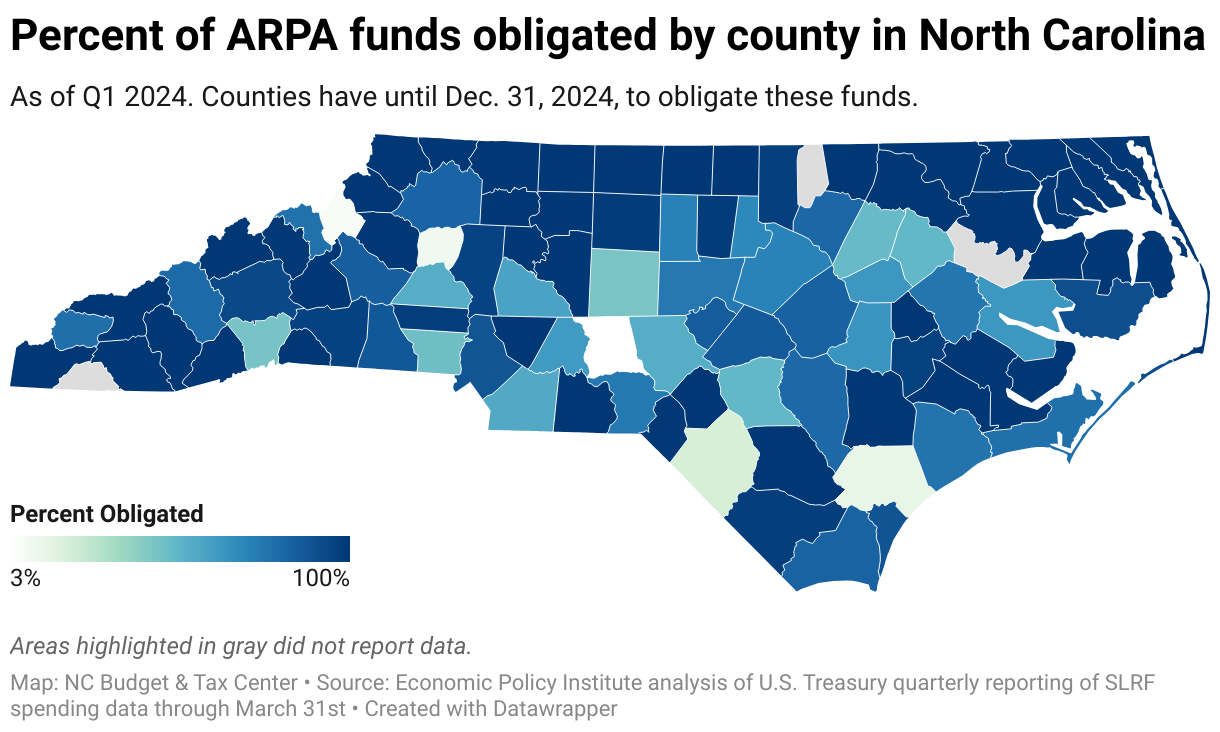 Percent of ARPA funds obligated by county in North Carolina
