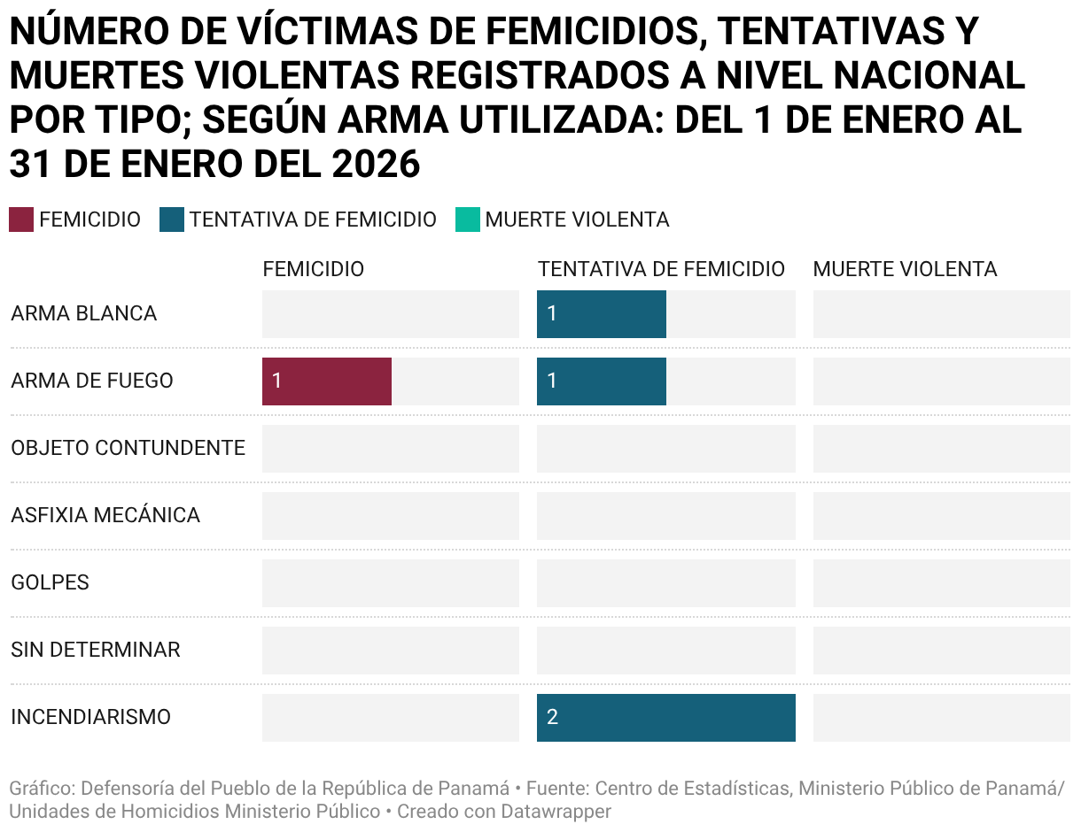 NÚMERO DE VÍCTIMAS DE FEMICIDIOS, TENTATIVAS Y MUERTES VIOLENTAS REGISTRADOS A NIVEL NACIONAL POR TIPO; SEGÚN ARMA UTILIZADA: DEL 1 DE ENERO AL 31 DE ENERO DEL 2026