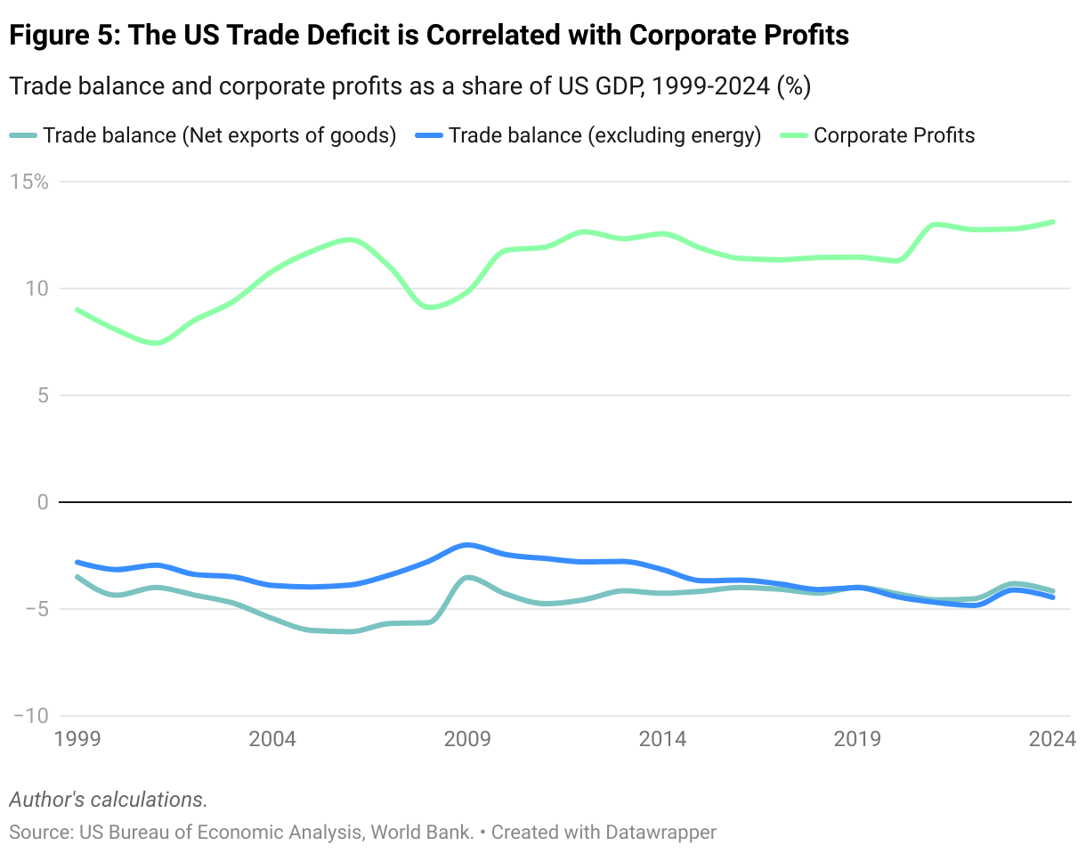 Trade balance and corporate profits as a share of US GDP, 1999-2024 (%)