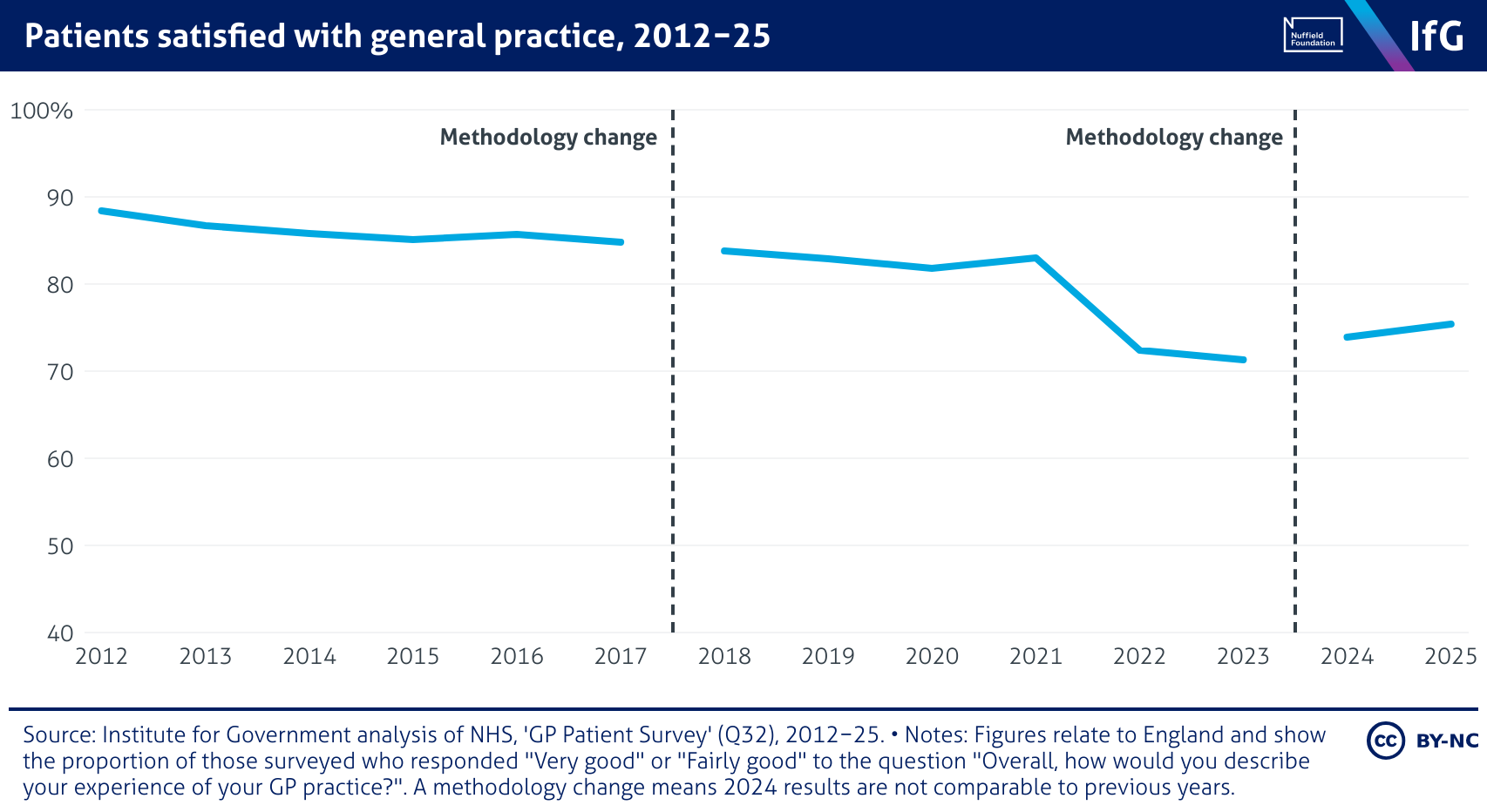 A line chart from the Institute for Government showing patients satisfied with general practice, 2012–25, where satisfaction has gradually declined over time but is affected by two major methodology changes. Between 2012 and 2017, satisfaction stayed high at around 84–88%, before slowly falling under the new methodology in 2018, reaching 71.3% by 2023. Following the 2024 methodology change, results are not directly comparable, but the data show a slight recovery to 75.4% in 2025.