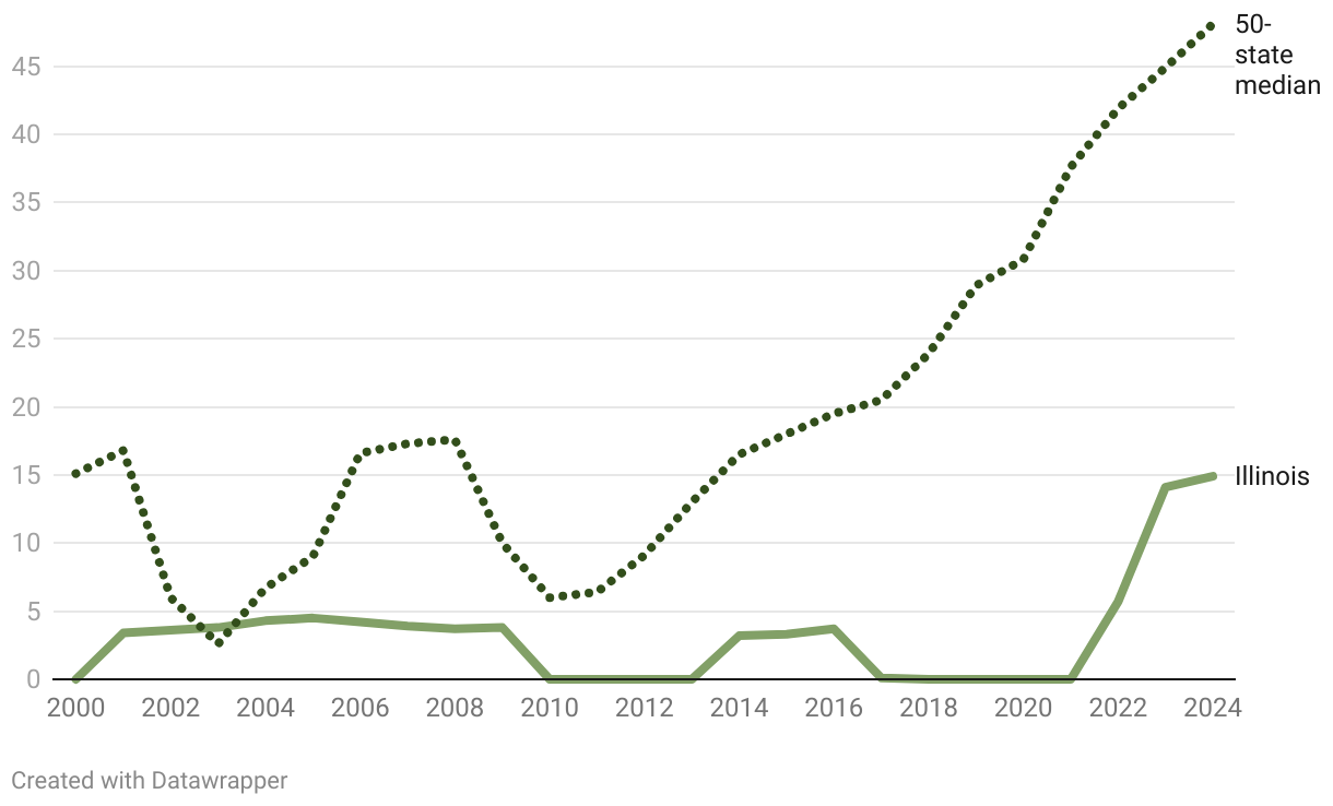 Illinois, 50-state median rainy-day fund balances, measured in days' worth of spending, FY 2000-FY 2024