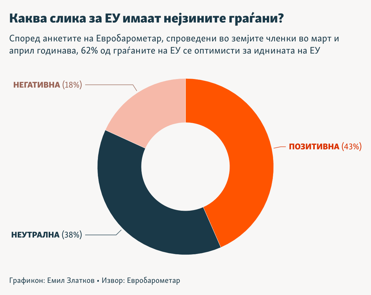 Според анкетите на Евробарометар, спроведени во земјите членки во март и април годинава, 62% од граѓаните на ЕУ се оптимисти за иднината на ЕУ