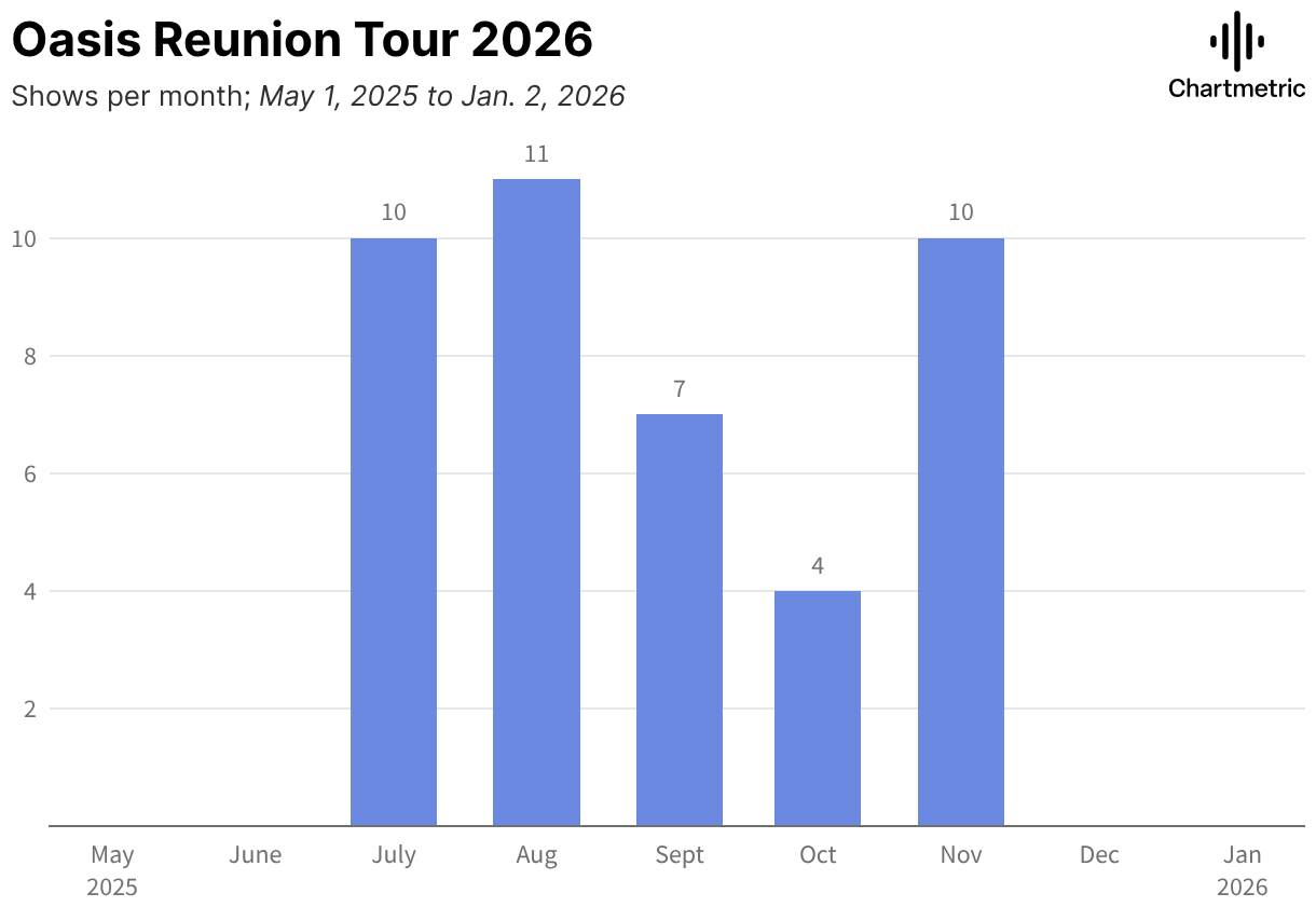 Shows per month; May 1, 2025 to Jan. 2, 2026