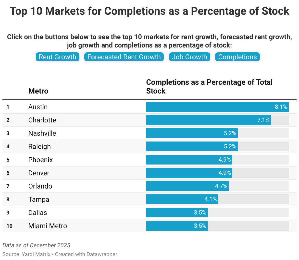 Click on the buttons below to see the top 10 markets for rent growth, forecasted rent growth, job growth and completions as a percentage of stock:
