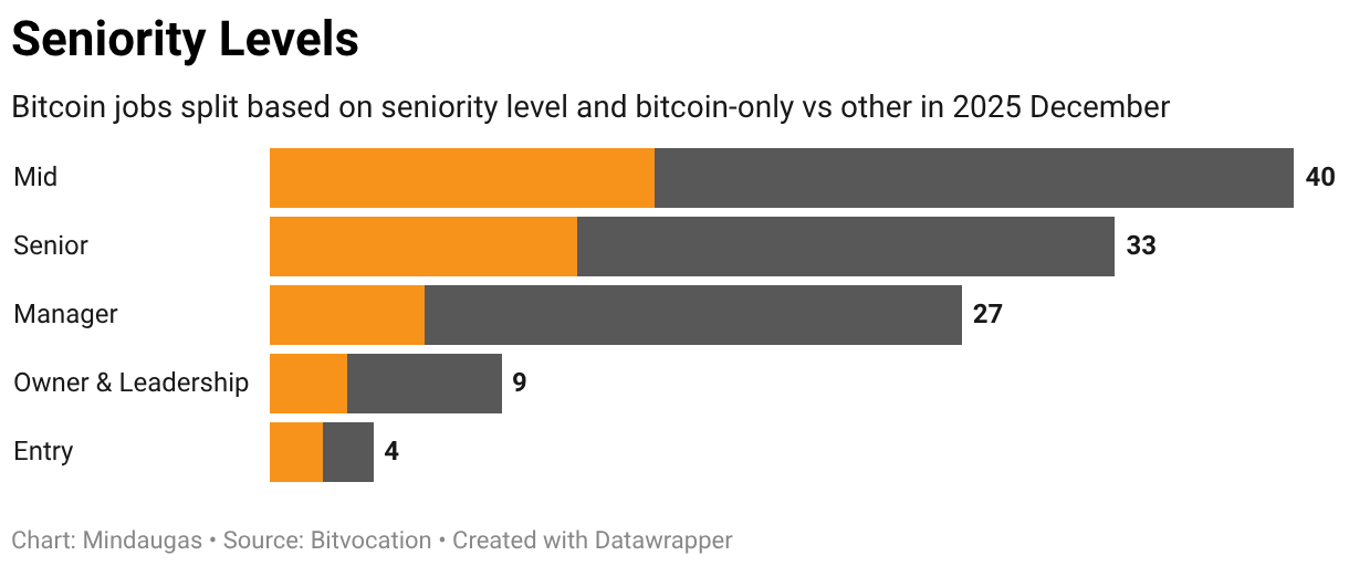 Bitcoin jobs split based on seniority level and bitcoin-only vs other in 2025 December