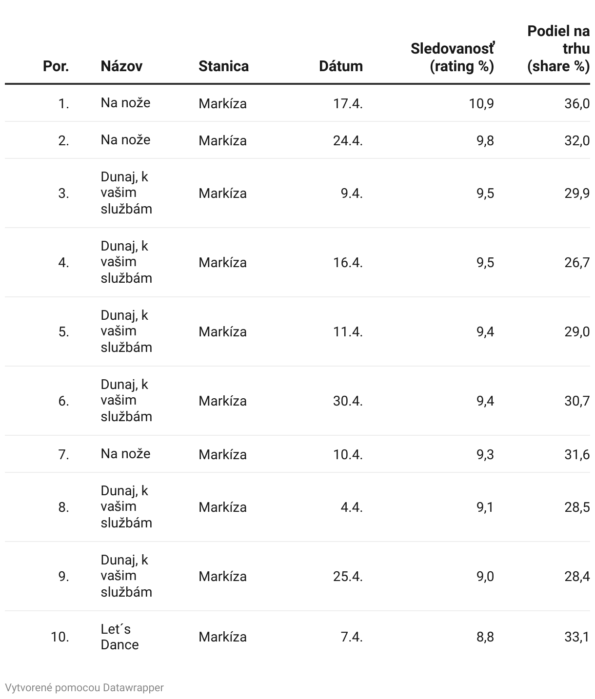 Rebríček najsledovanejších nespravodajských relácií v apríli 2024, podľa sledovanosti (rating) a podielu na trhu (share), v cieľovej skupine 13-55 so započítaním trojdňovej oneskorenej sledovanosti.