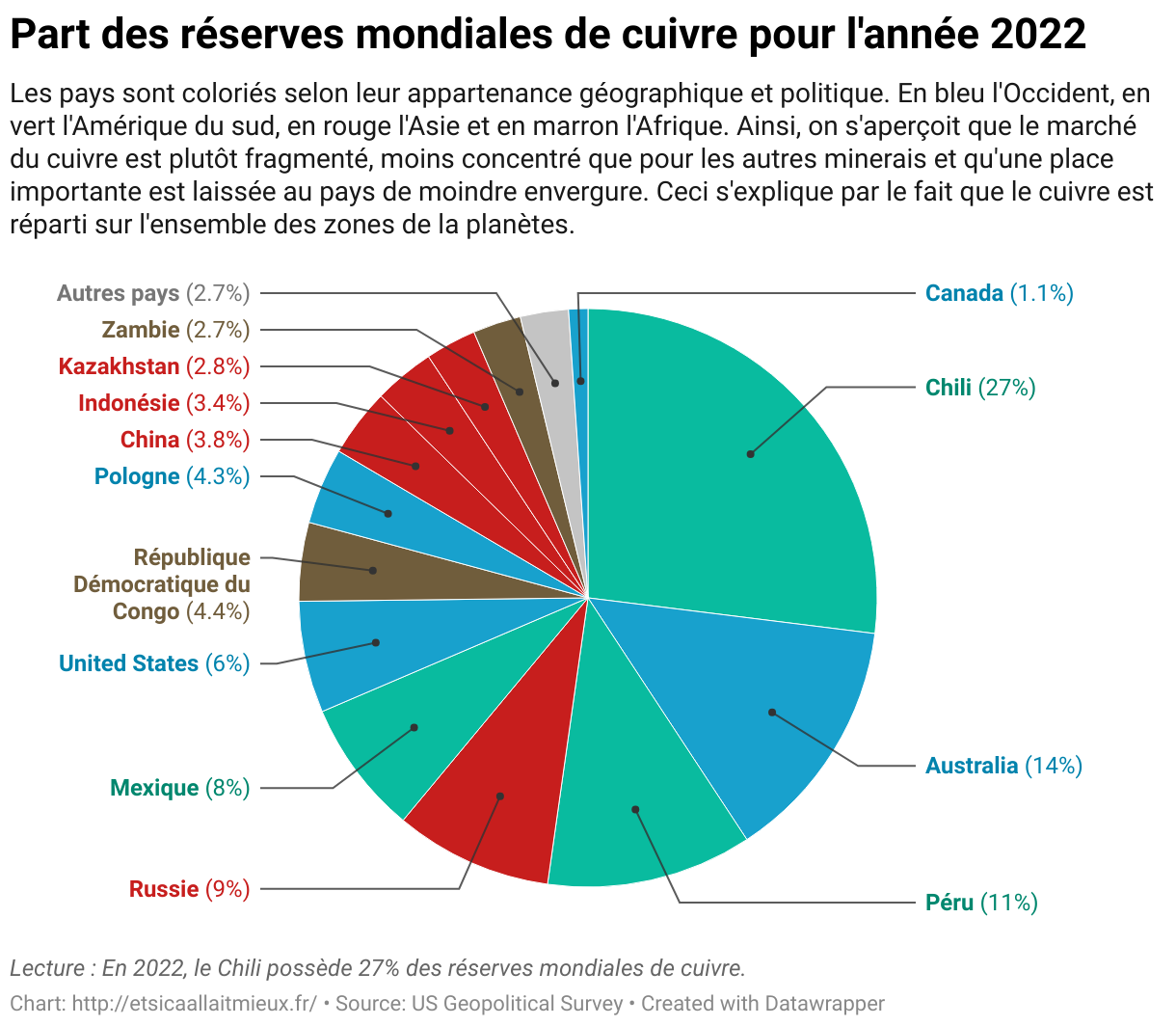 Les pays sont coloriés selon leur appartenance géographique et politique. En bleu l'Occident, en vert l'Amérique du sud, en rouge l'Asie et en marron l'Afrique. Ainsi, on s'aperçoit que le marché du cuivre est plutôt fragmenté, moins concentré que pour les autres minerais et qu'une place importante est laissée au pays de moindre envergure. Ceci s'explique par le fait que le cuivre est réparti sur l'ensemble des zones de la planètes.
