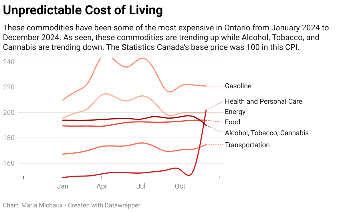 These commodities have been some of the most expensive in Ontario from January 2024 to December 2024. As seen, these commodities are trending up while Alcohol, Tobacco, and Cannabis are trending down. The Statistics Canada's base price was 100 in this CPI.