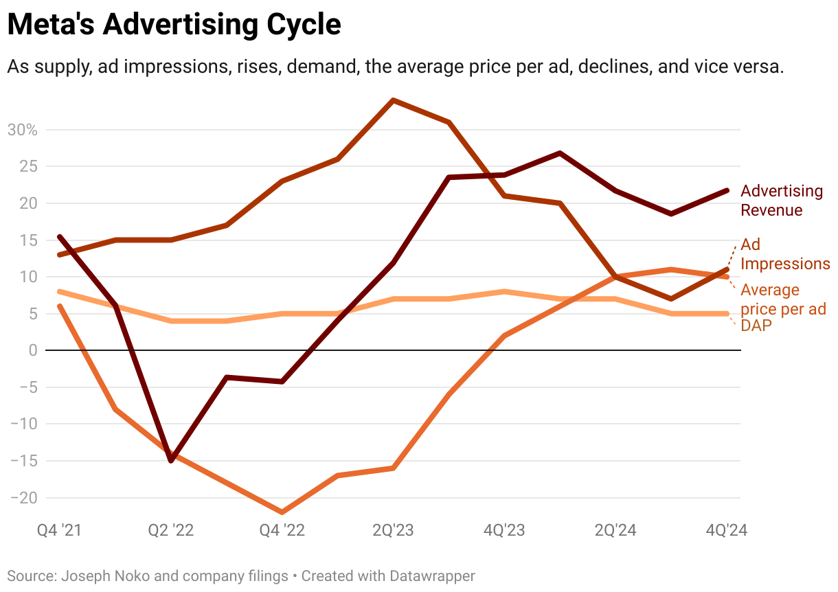 As supply, ad impressions, rises, demand, the average price per ad, declines, and vice versa.