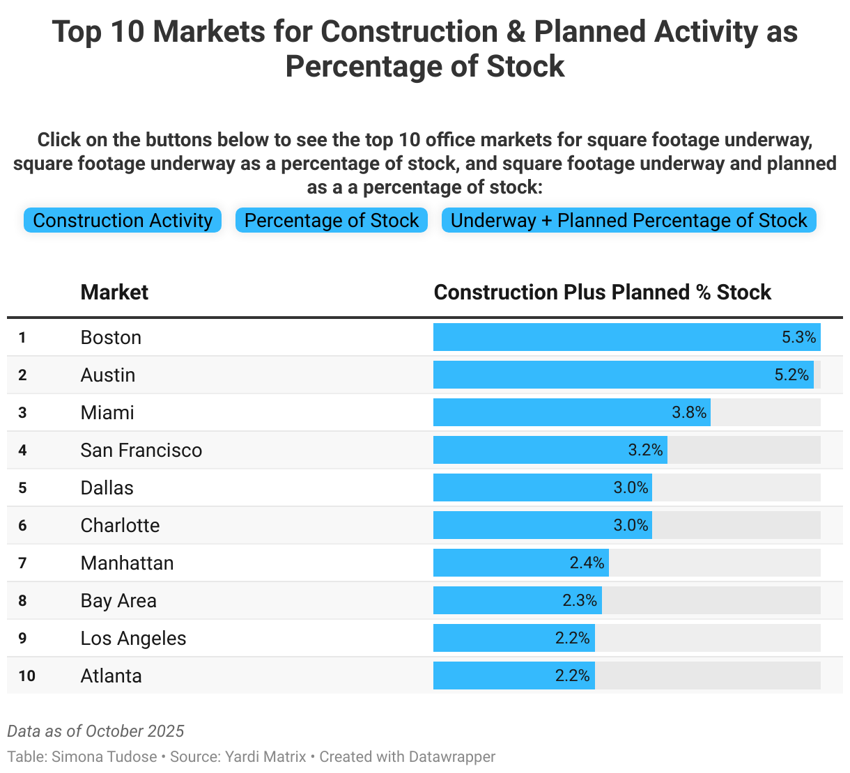 Click on the buttons below to see the top 10 office markets for square footage underway, square footage underway as a percentage of stock, and square footage underway and planned as a a percentage of stock: