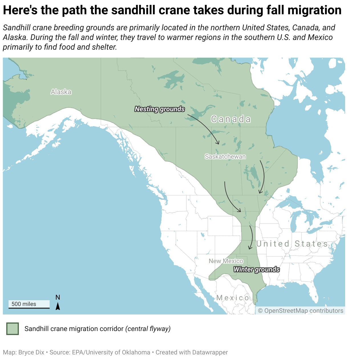 Sandhill crane breeding grounds are primarily located in the northern United States, Canada, and Alaska. During the fall and winter, they travel to warmer regions in the southern U.S. and Mexico primarily to find food and shelter.