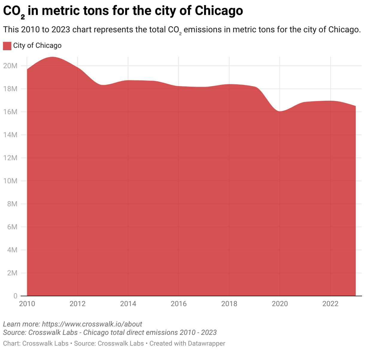 This 2010 to 2023 chart represents the total CO₂ emissions in metric tons for the city of Chicago.
