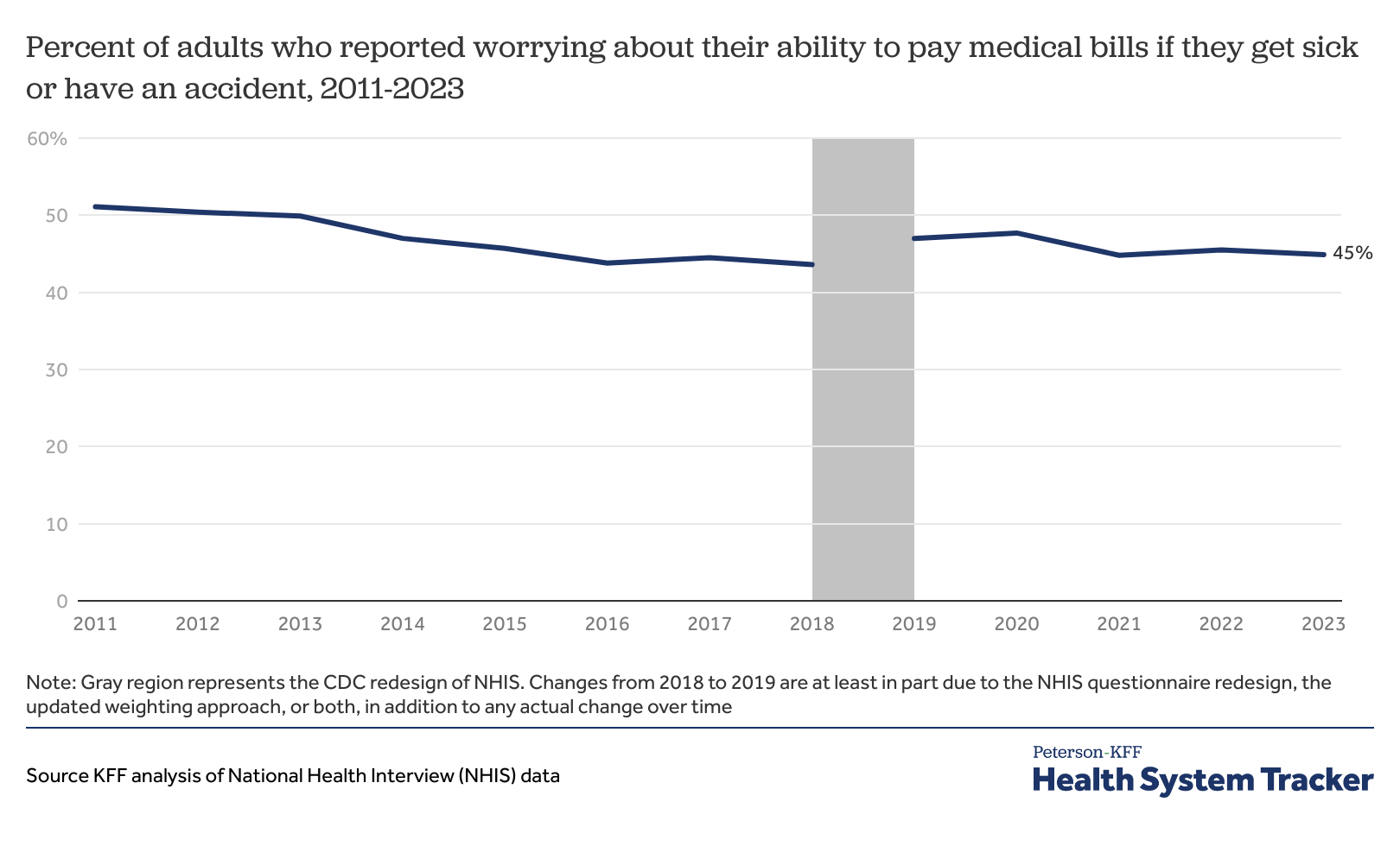 Percent of adults who reported worrying about their ability to pay medical bills if they get sick or have an accident, 2011-2023