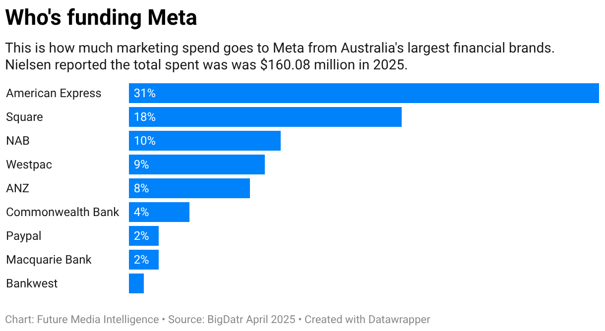 This is how much marketing spend goes to Meta from Australia's largest financial brands. Nielsen reported the total spent was was $160.08 million in 2025.