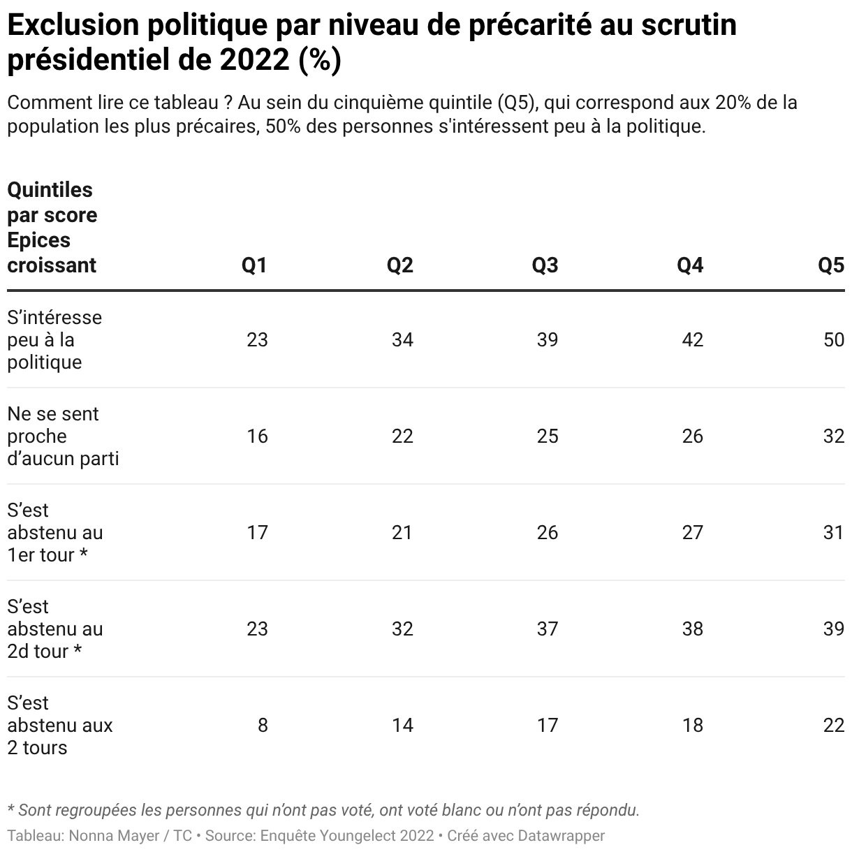 Comment lire ce tableau ? Au sein du cinquième quintile (Q5), qui correspond aux 20% de la population les plus précaires, 50% des personnes s'intéressent peu à la politique.