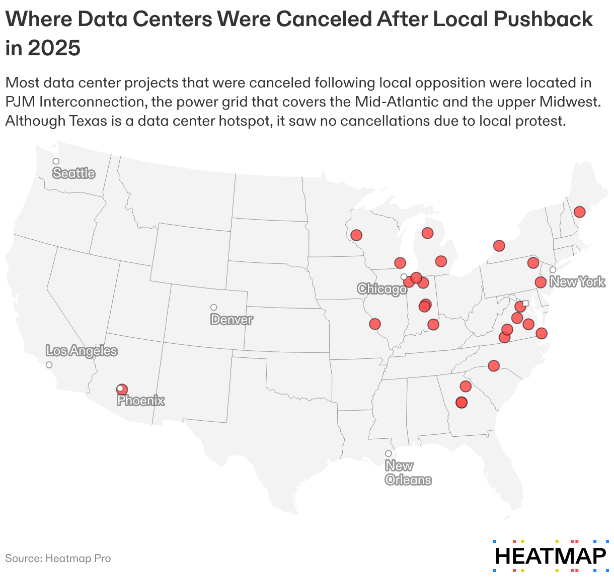 Most data center projects that were canceled following local opposition were located in PJM Interconnection, the power grid that covers the Mid-Atlantic and the upper Midwest. Although Texas is a data center hotspot, it saw no cancellations due to local protest.