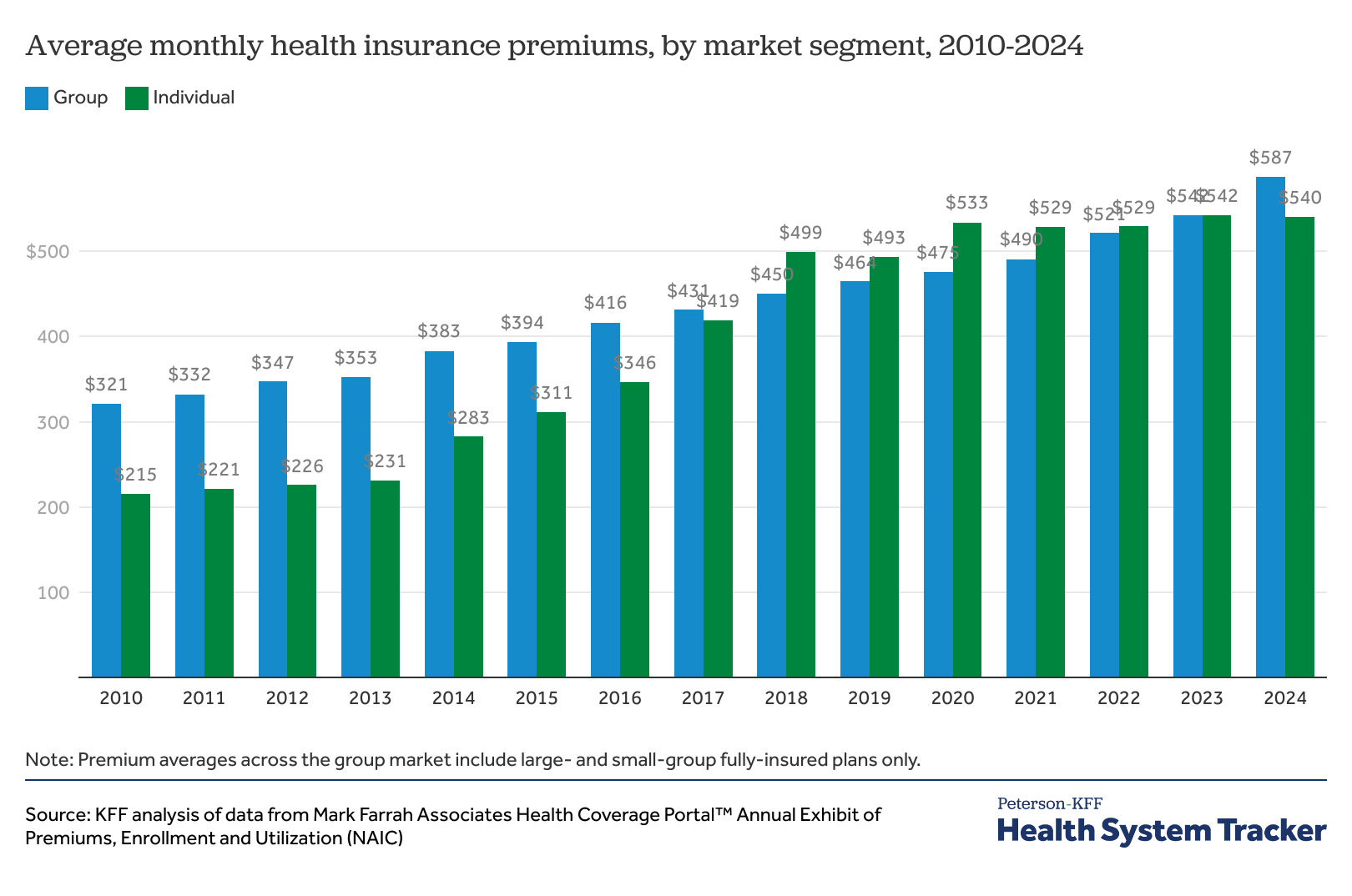 Average monthly health insurance premiums, by market segment, 2010-2024