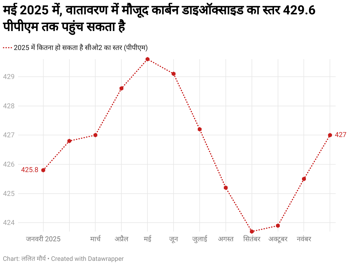 मई 2025 में, वातावरण में मौजूद कार्बन डाइऑक्साइड का स्तर 429.6 पीपीएम तक पहुंच सकता है