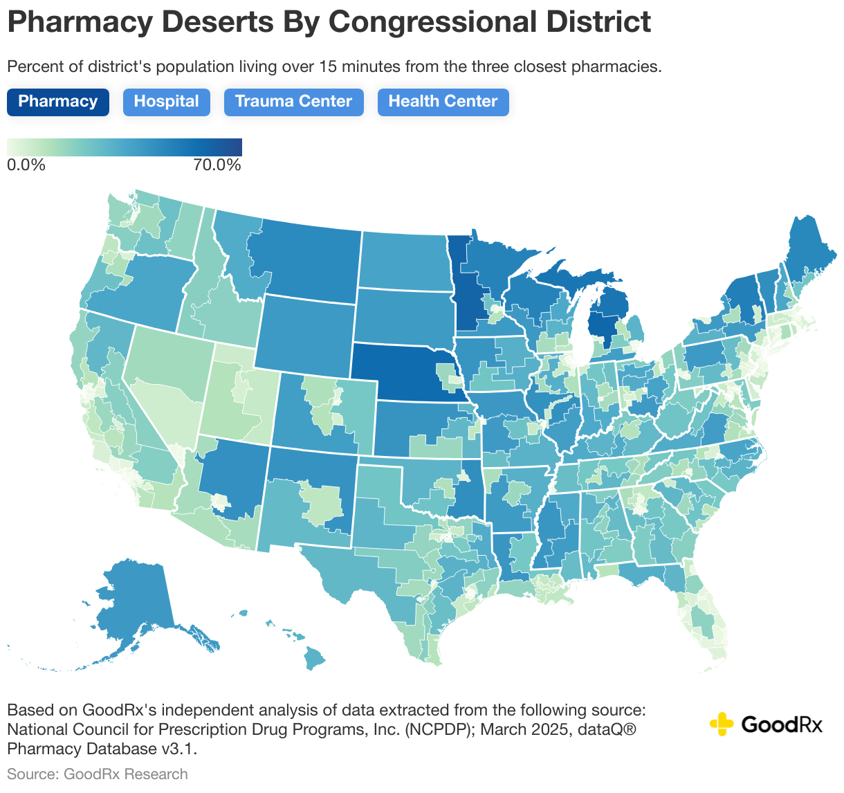 Percent of district's population living over 15 minutes from the three closest pharmacies. Pharmacy Hospital Trauma Center Health Center