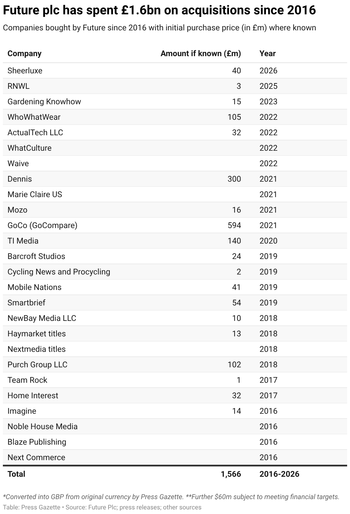 Companies bought by Future since 2016 with initial purchase price (in £m) where known