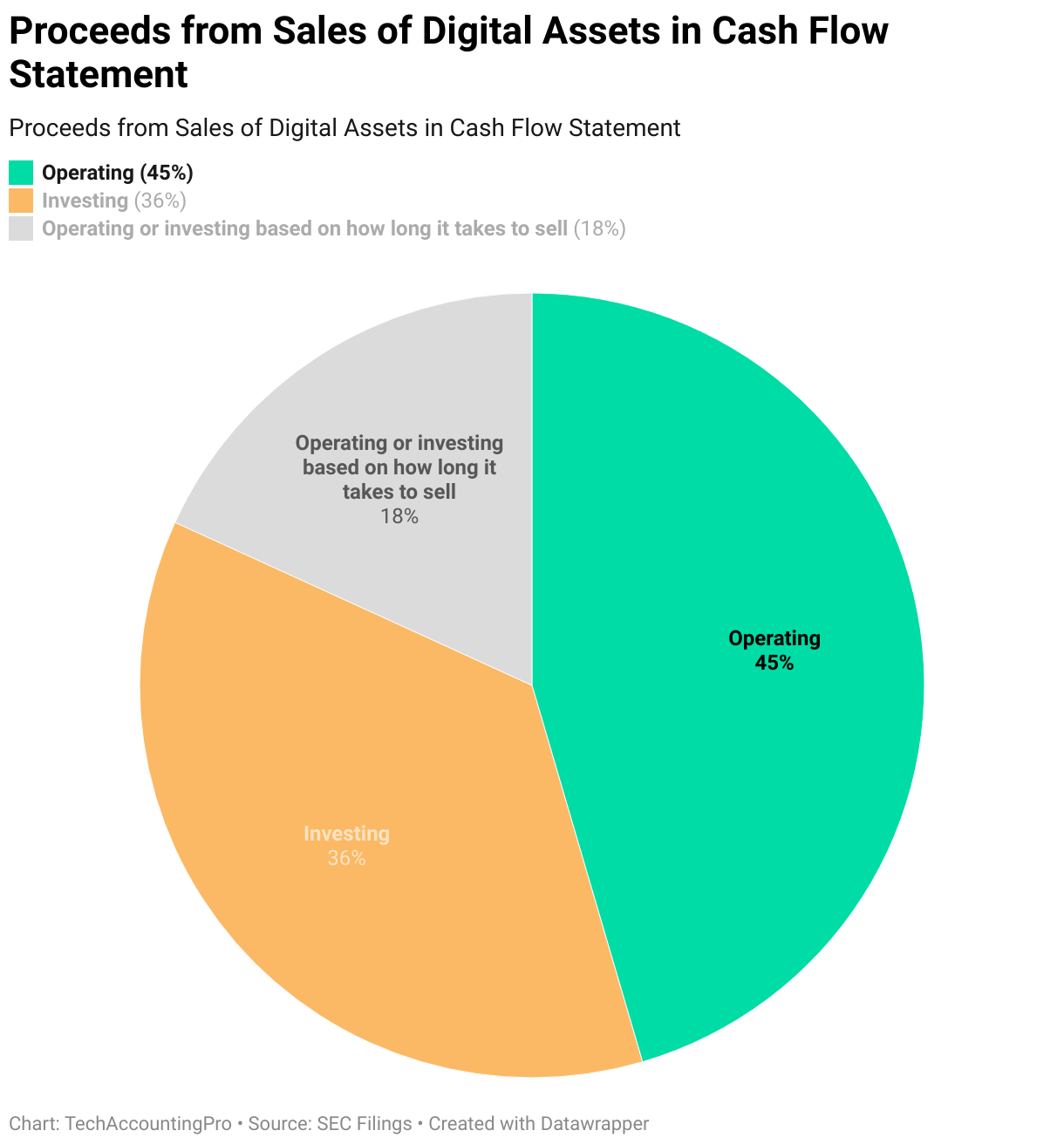 Out of 11 companies surveyed: 5 recorded proceeds from bitcoin sales as operating cash flows; 4 as investing cash flows; 2 recorded proceeds from sales that occurred within a short timeframe from receipt of assets as operating cash flows, but outside of this short timeframe any proceeds were recorded in investing cash flows.