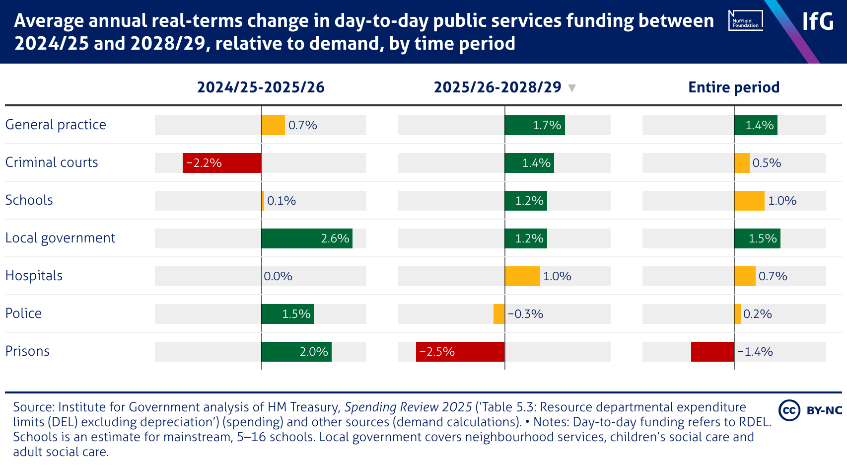 Average annual real-terms change in day-to-day public services funding between 2024/25 and 2028/29, relative to demand, by time period