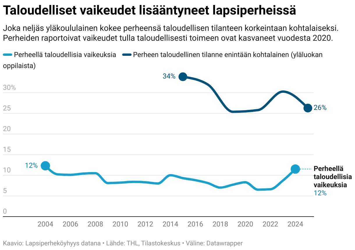 Joka neljäs yläkoululainen kokee perheensä taloudellisen tilanteen korkeintaan kohtalaiseksi. Perheiden raportoivat vaikeudet tulla taloudellisesti toimeen ovat kasvaneet vuodesta 2020.