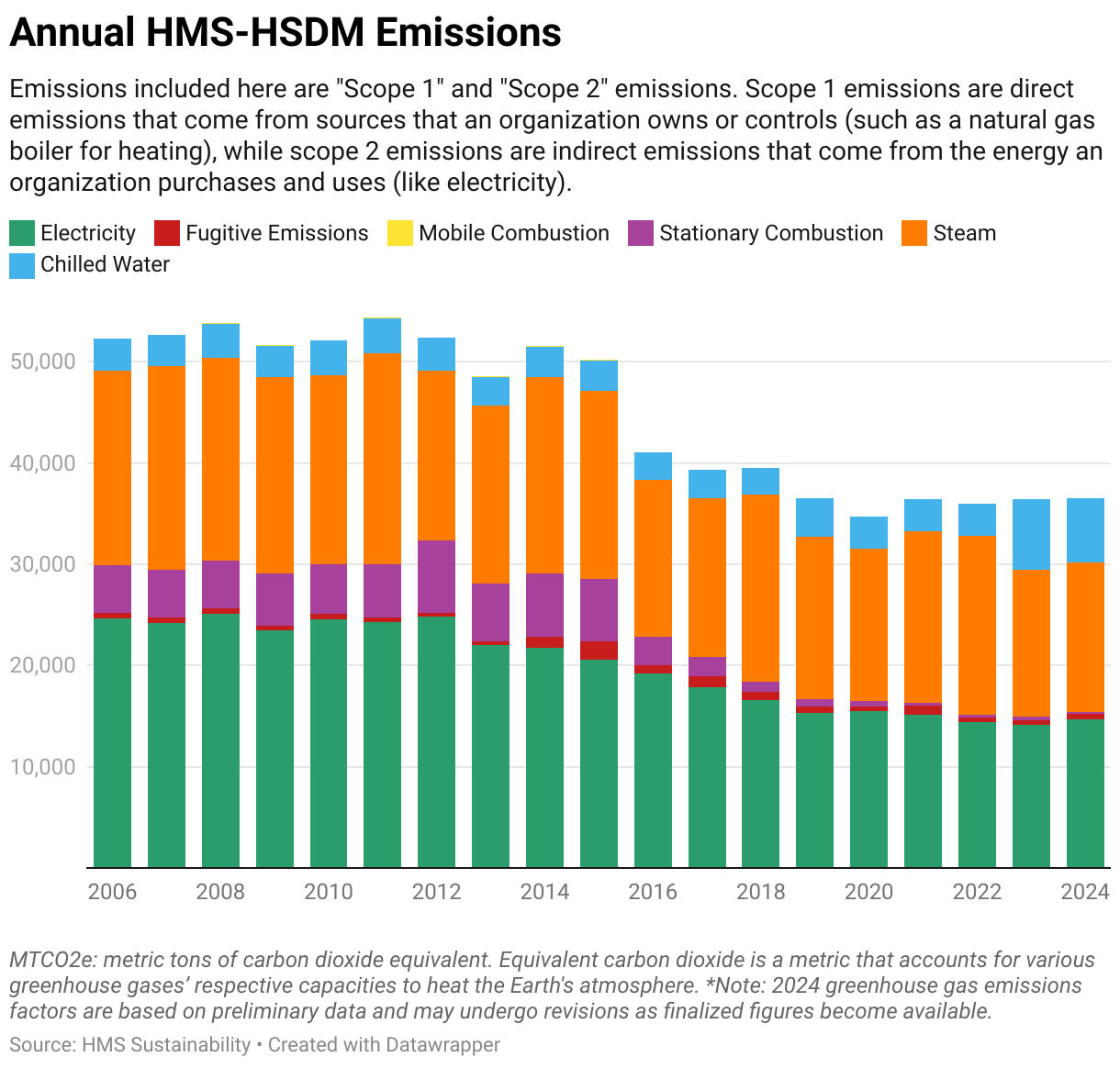 Emissions included here are "Scope 1" and "Scope 2" emissions. Scope 1 emissions are direct emissions that come from sources that an organization owns or controls (such as a natural gas boiler for heating), while scope 2 emissions are indirect emissions that come from the energy an organization purchases and uses (like electricity).