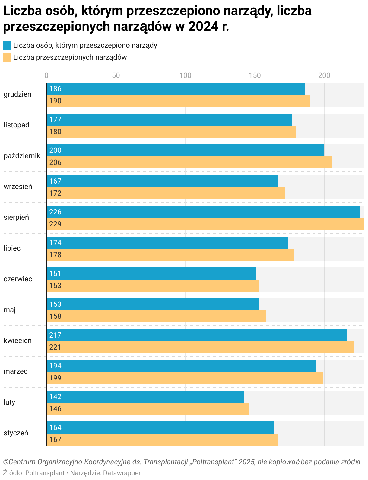 Liczba osób, którym przeszczepiono narządy, liczba przeszczepionych narządów w 2024 r.