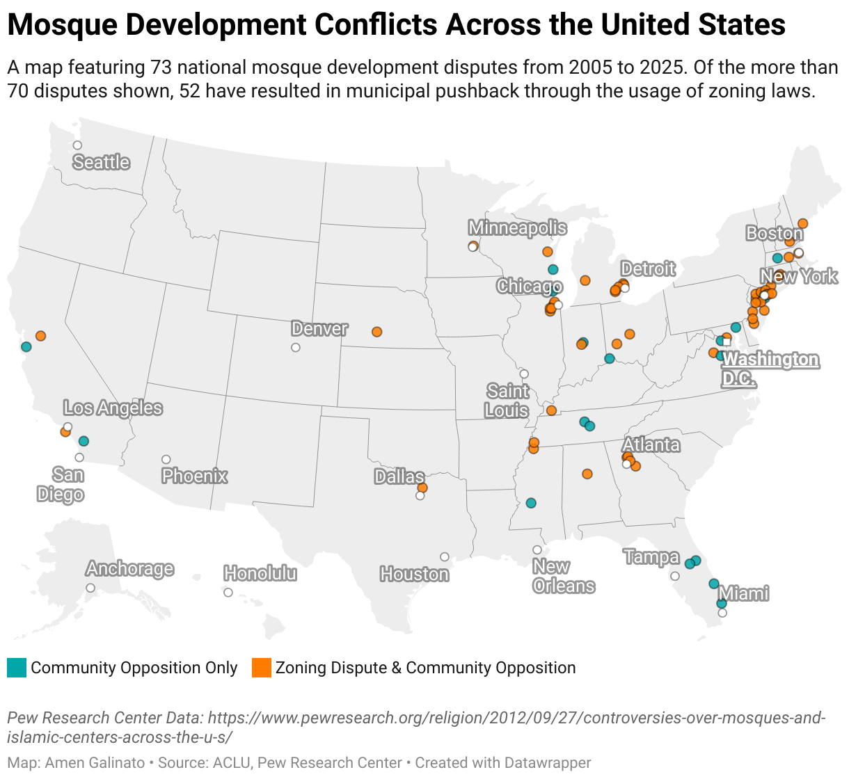 A map featuring 73 national mosque development disputes from 2005 to 2025. Of the more than 70 disputes shown, 52 have resulted in municipal pushback through the usage of zoning laws.