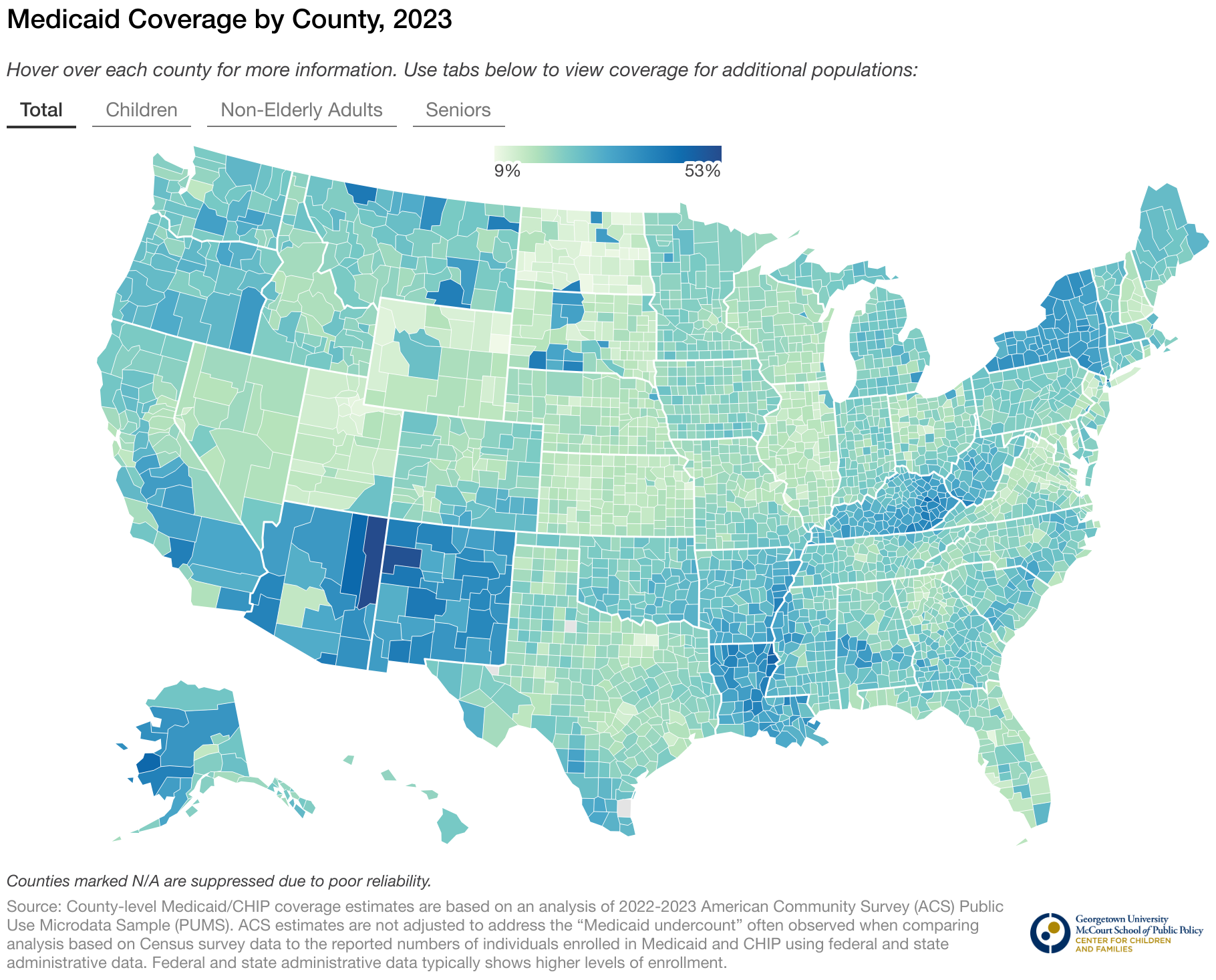 Hover over each county for more information. Use tabs below to view coverage for additional populations: Total Children Non-Elderly Adults Seniors