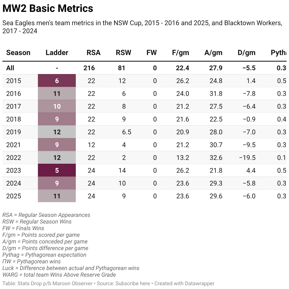 Sea Eagles men's team metrics in the NSW Cup, 2015 - 2016 and 2025, and Blacktown Workers, 2017 - 2024