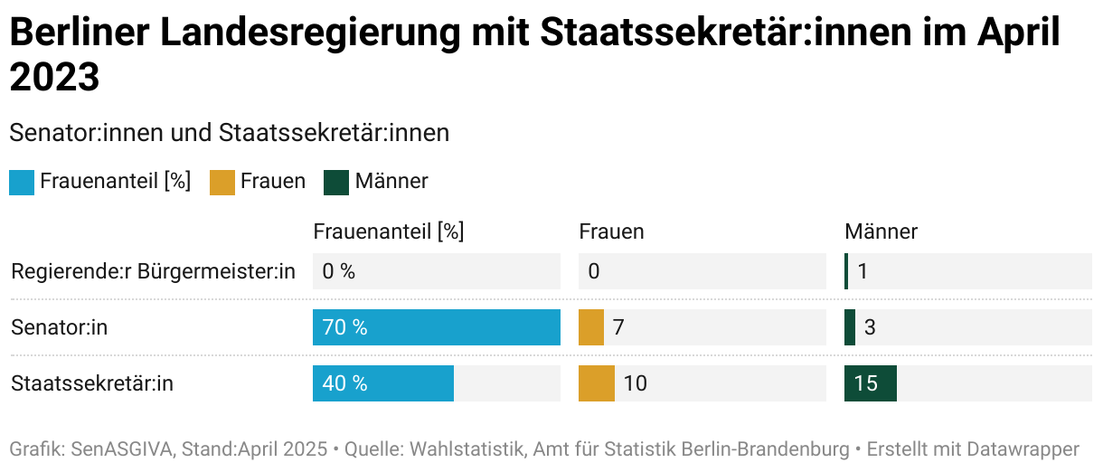 Der Frauenanteil der Landesregierung war im April 2023 fast ausgewogen. Berlin hatte in dieser Wahlperiode einen Bürgermeister und mit 7 Frauen mehr Senatorinnen als Senatoren (3). Darüber hinaus gab es 10 Staatssekretärinnen und 15 Staatssekretäre.