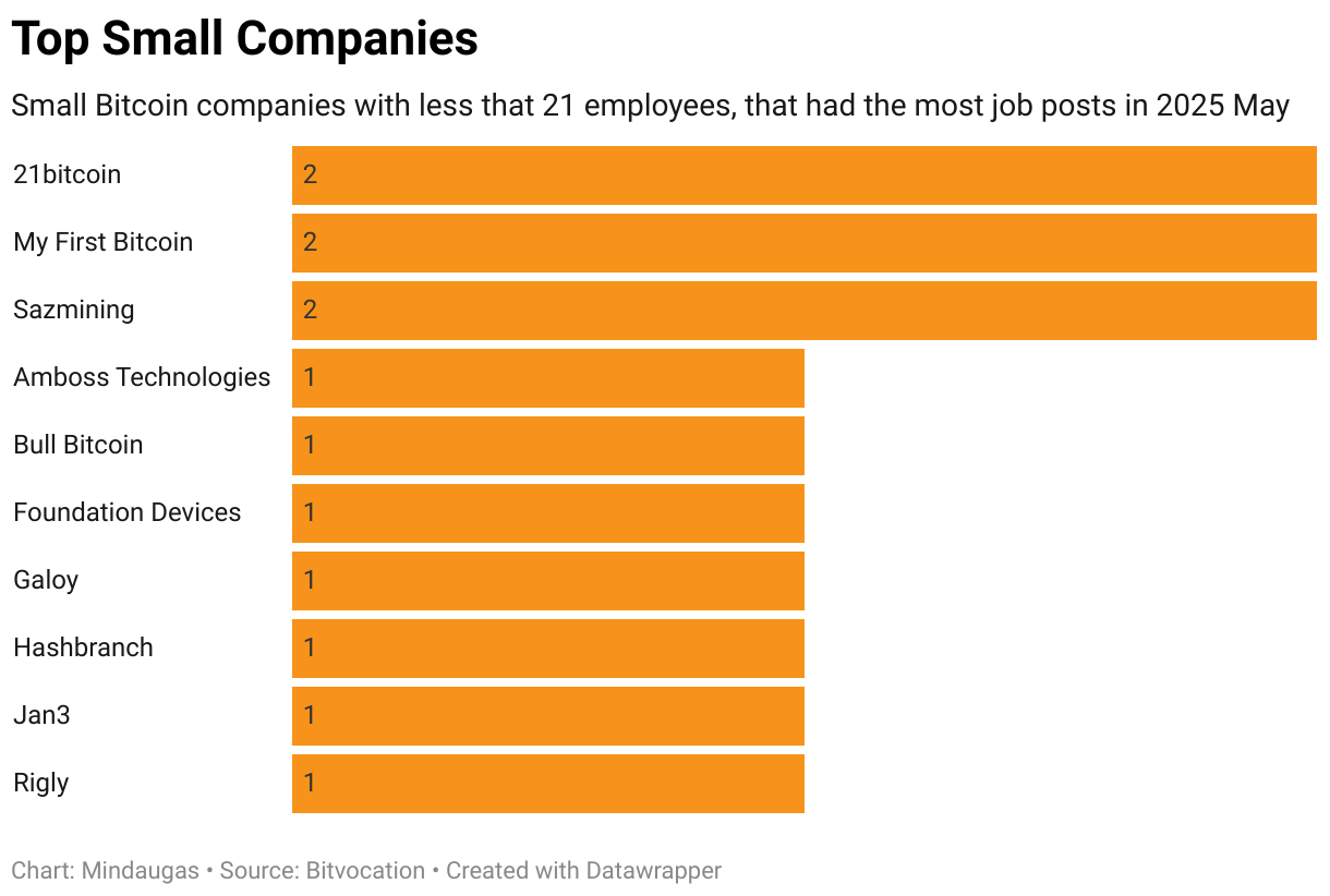 Small Bitcoin companies with less that 21 employees, that had the most job posts in 2025 May