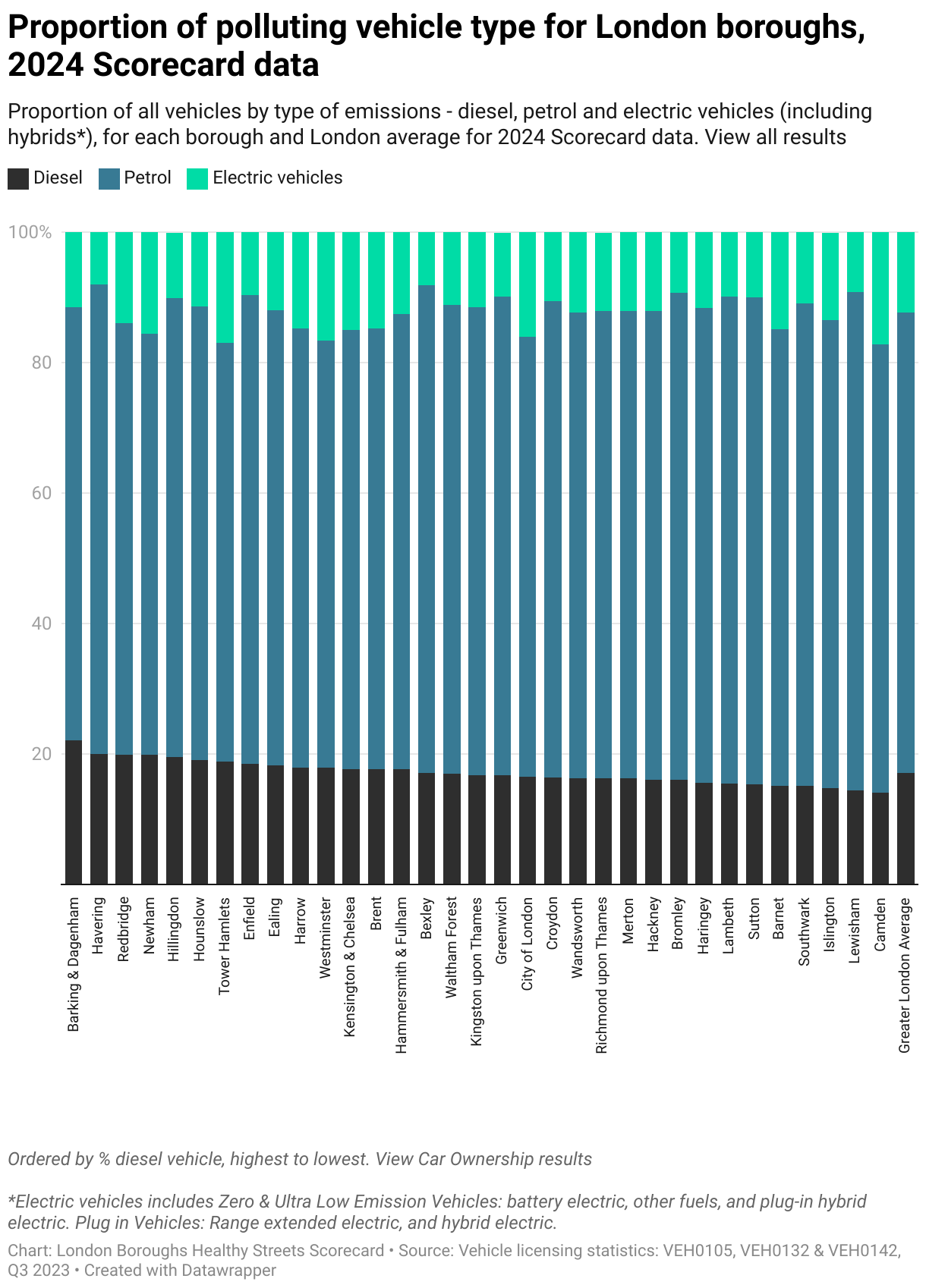 Proportion of all vehicles by type of emissions - diesel, petrol and electric vehicles (including hybrids*), for each borough and London average for 2024 Scorecard data. View all results