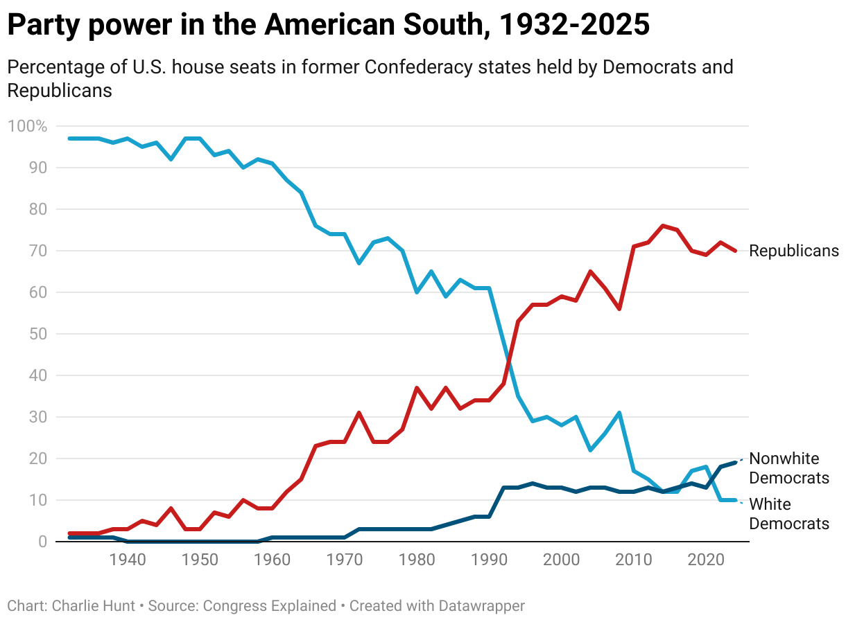 Percentage of U.S. house seats in former Confederacy states held by Democrats and Republicans