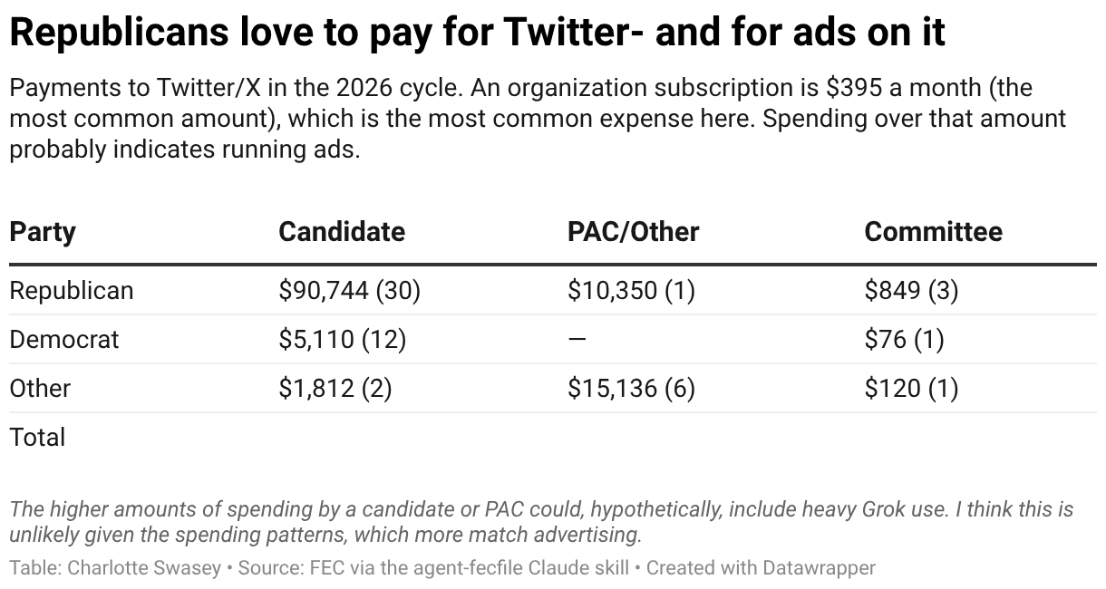 Payments to Twitter/X in the 2026 cycle. An organization subscription is $395 a month (the most common amount), which is the most common expense here. Spending over that amount probably indicates running ads.