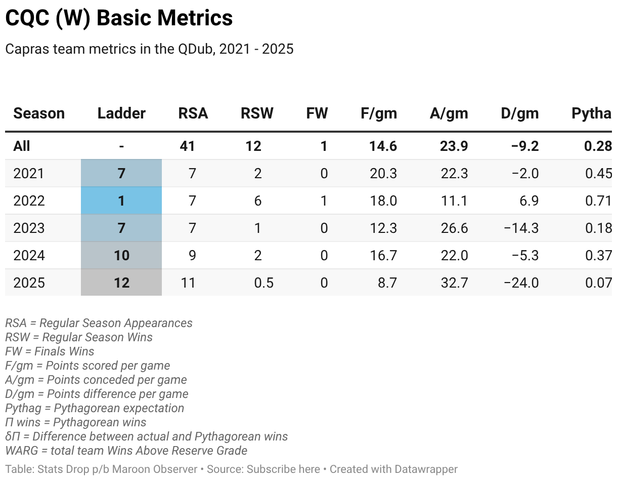 Capras team metrics in the QDub, 2021 - 2025