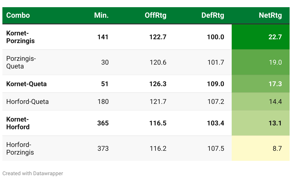 Advanced metrics for the Celtics' double-big lineups this season, sorted by net rating: