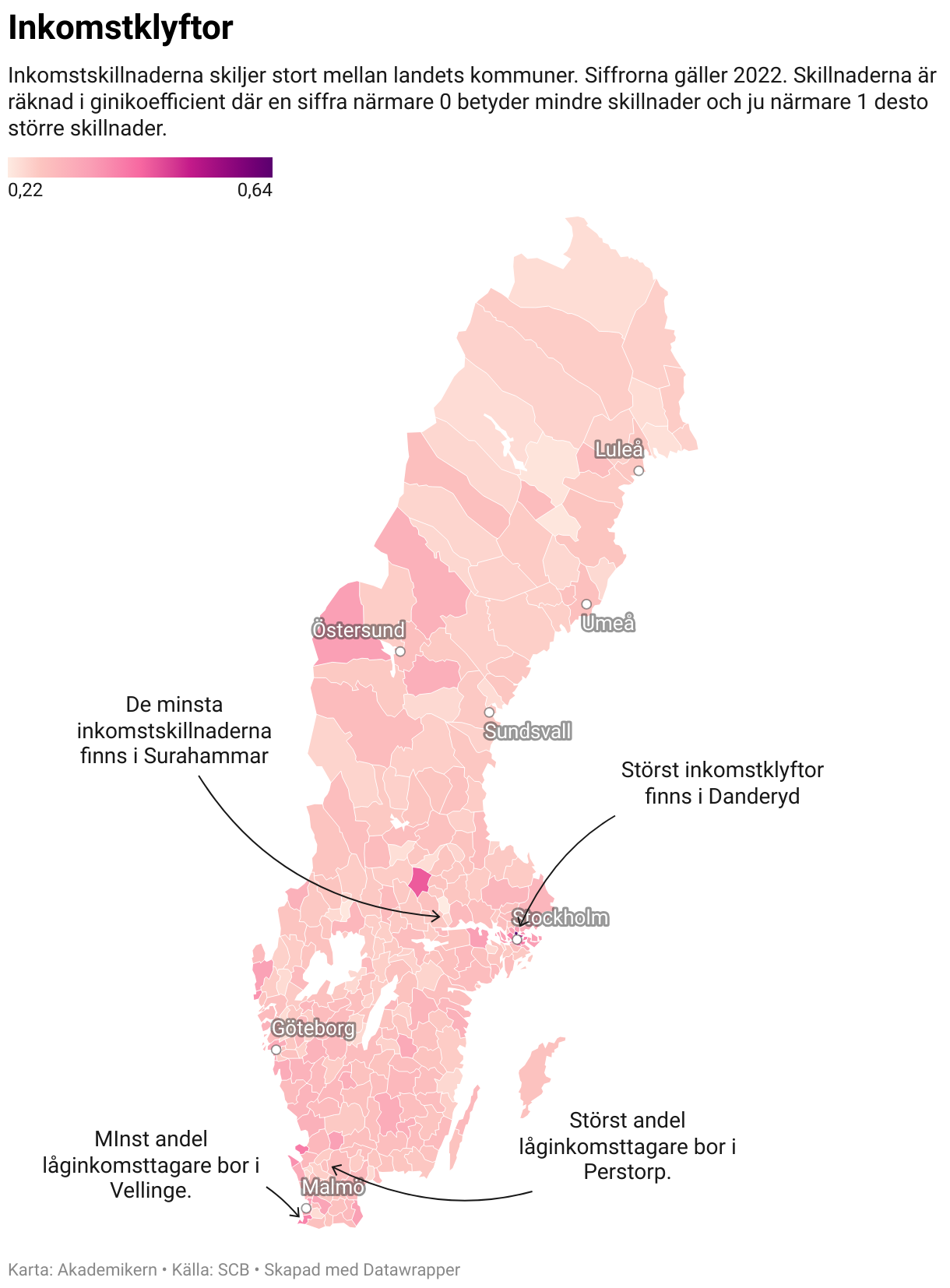Inkomstskillnaderna skiljer stort mellan landets kommuner. Siffrorna gäller 2022. Skillnaderna är räknad i ginikoefficient där en siffra närmare 0 betyder mindre skillnader och ju närmare 1 desto större skillnader.