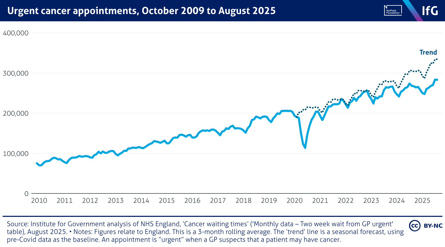 A line chart from the Institute for Government showing Urgent cancer appointments, October 2009 to August 2025. The number of urgent cancer appointments has more than tripled since 2009, rising from under 75,105 to over 282,981 by mid-2025. There was a sharp drop in 2020 due to the pandemic, but activity quickly rebounded and now exceeds the pre-pandemic trend.