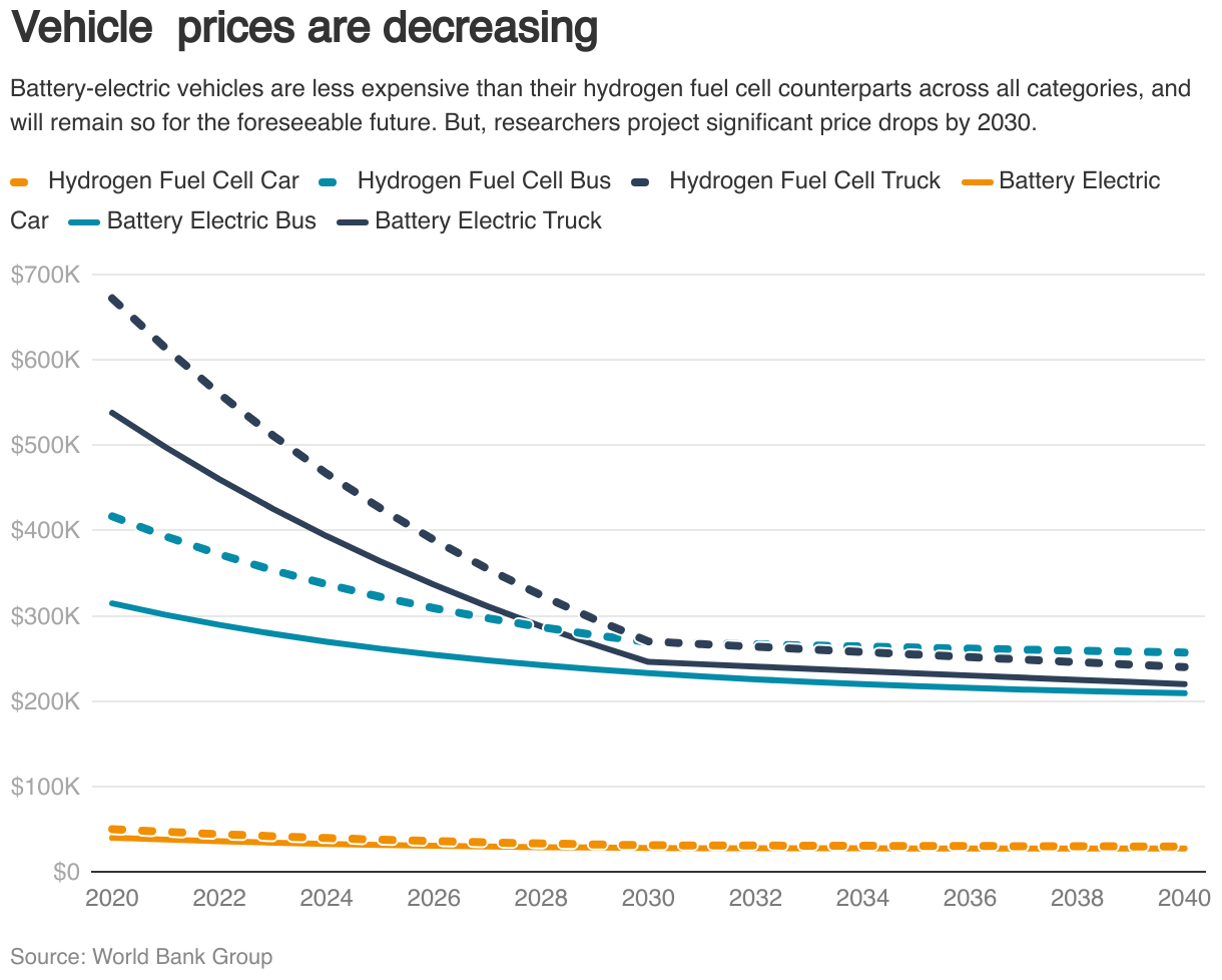 Battery-electric vehicles are less expensive than their hydrogen fuel cell counterparts across all categories, and will remain so for the foreseeable future. But, researchers project significant price drops by 2030.