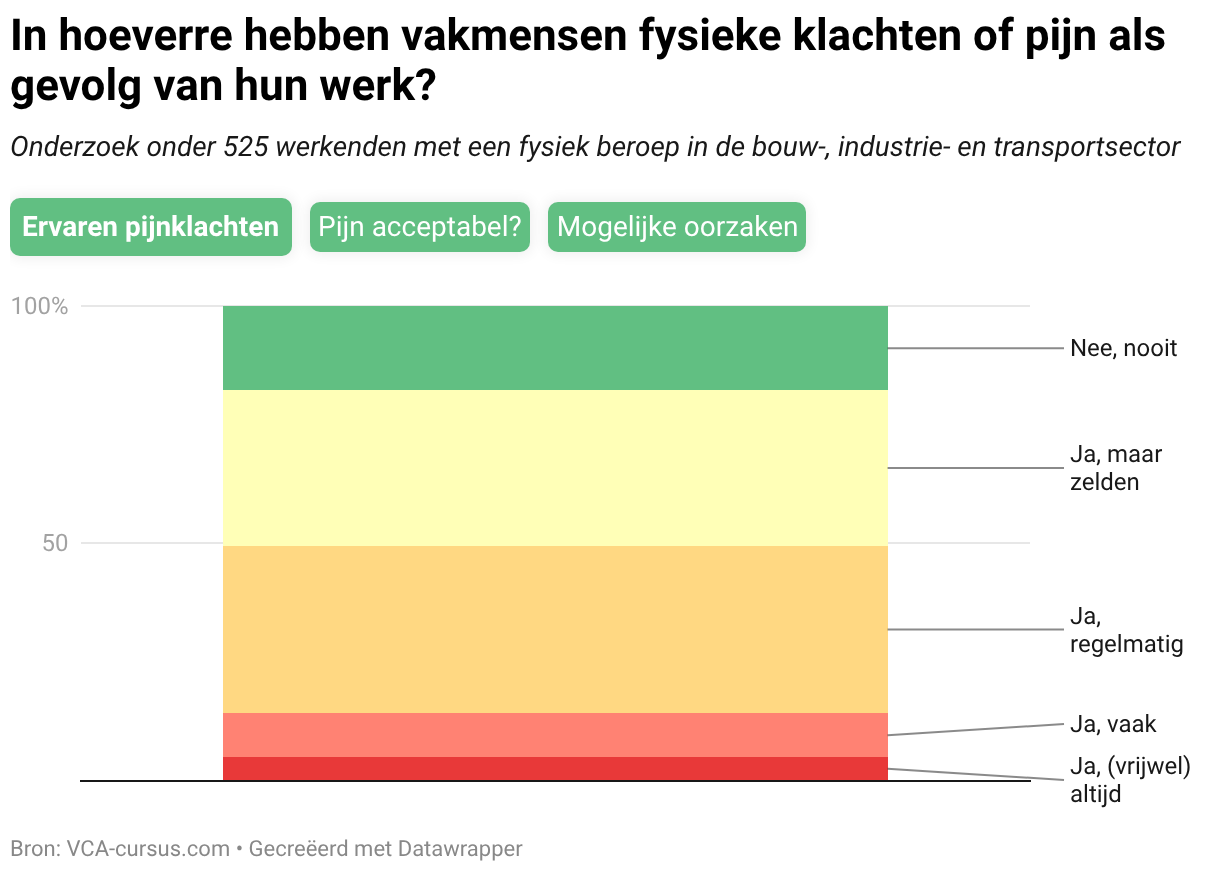 Onderzoek onder 525 werkenden met een fysiek beroep in de bouw-, industrie- en transportsector Ervaren pijnklachten Pijn acceptabel? Mogelijke oorzaken