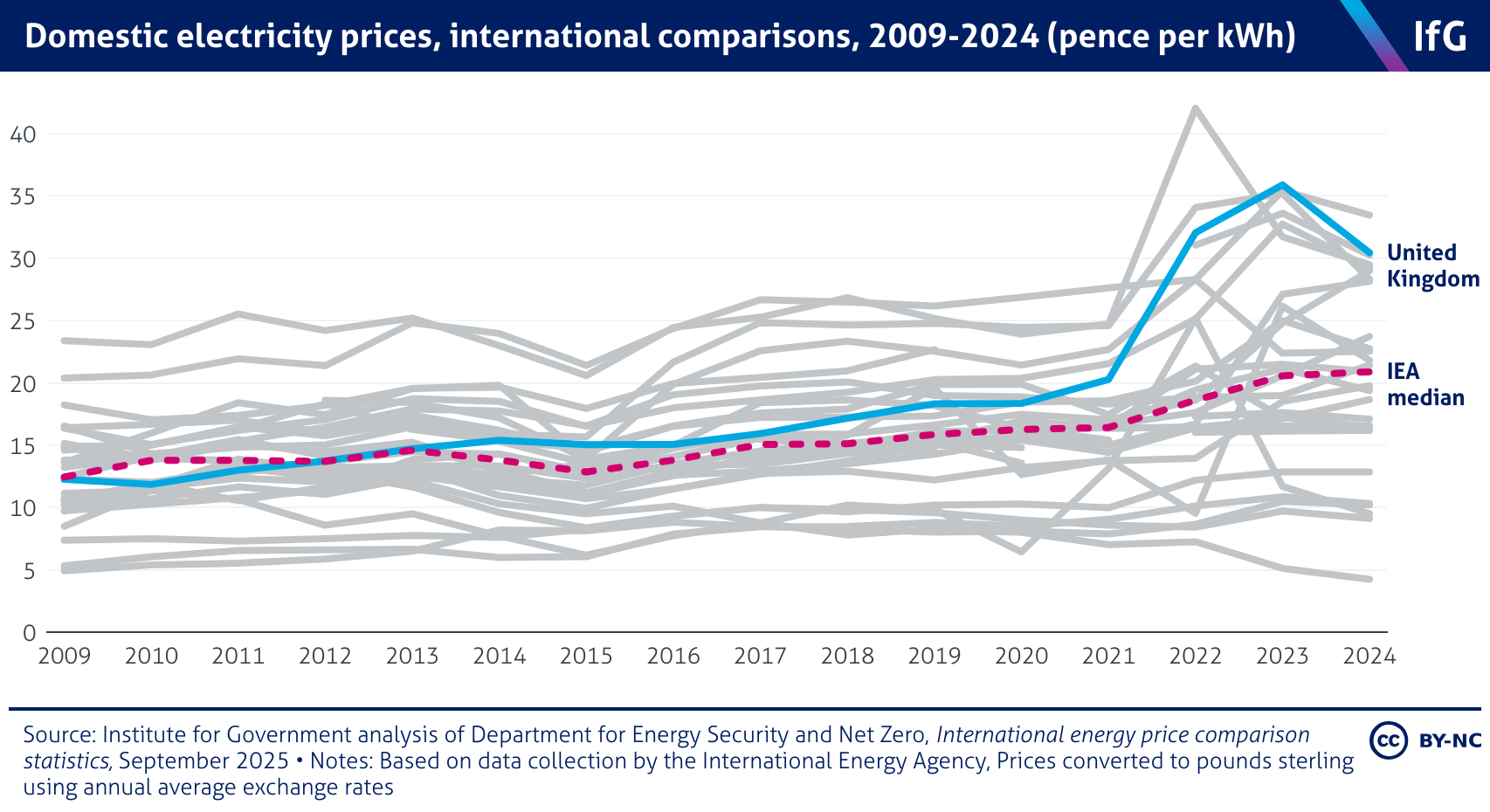 Domestic electricity prices, international comparisons, 2009-2024 (pence per kWh)