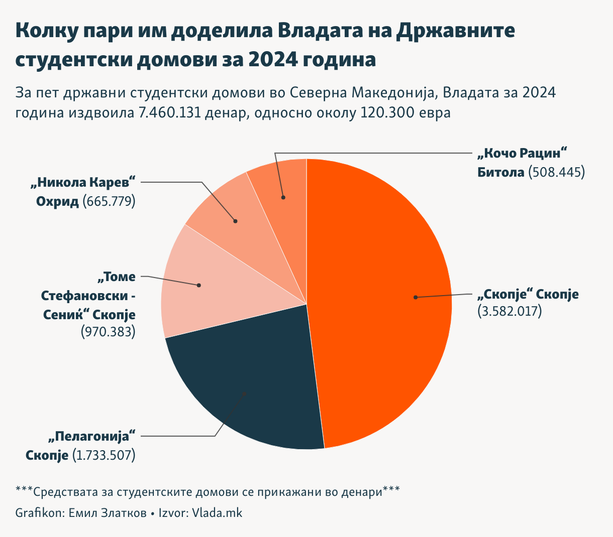 За пет државни студентски домови во Северна Македонија, Владата за 2024 година издвоила 7.460.131 денар, односно околу 120.300 евра