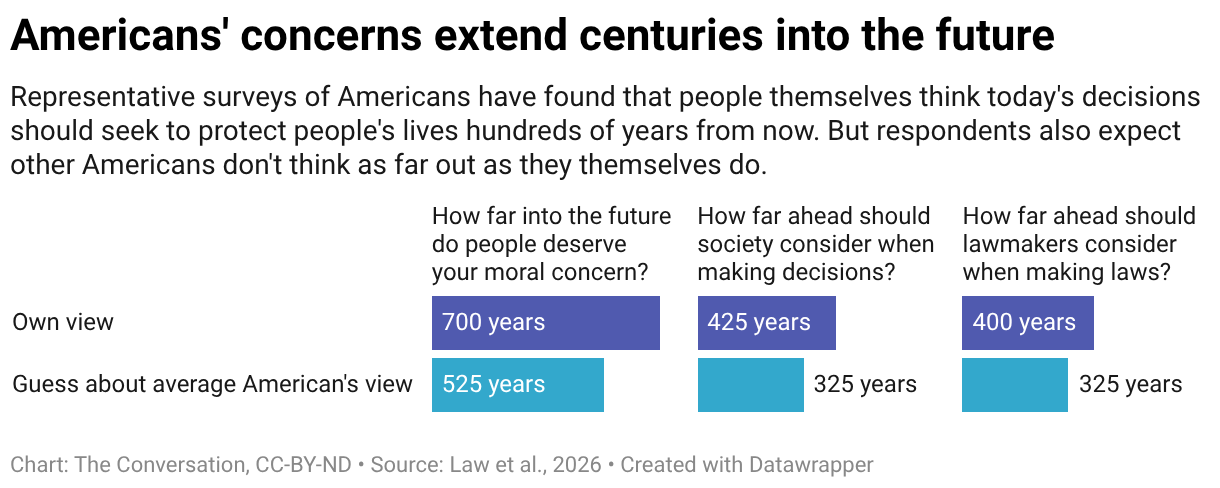 Representative surveys of Americans have found that people themselves think today's decisions should seek to protect people's lives hundreds of years from now. But respondents also expect other Americans don't think as far out as they themselves do.