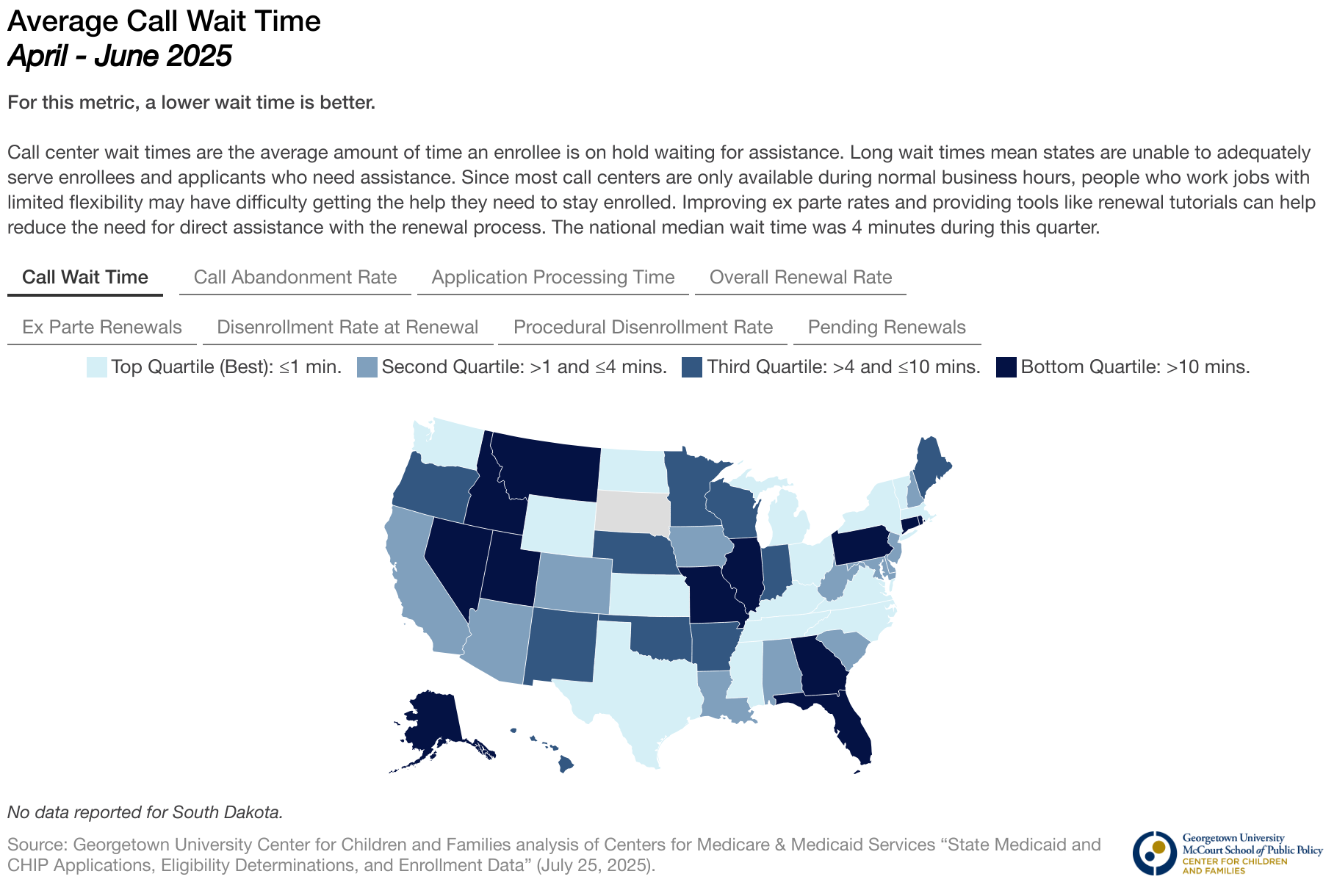 Call center wait times are the average amount of time an enrollee is on hold waiting for assistance. Long wait times mean states are unable to adequately serve enrollees and applicants who need assistance. Since most call centers are only available during normal business hours, people who work jobs with limited flexibility may have difficulty getting the help they need to stay enrolled. Improving ex parte rates and providing tools like renewal tutorials can help reduce the need for direct assistance with the renewal process. The national median wait time was 4 minutes during this quarter.