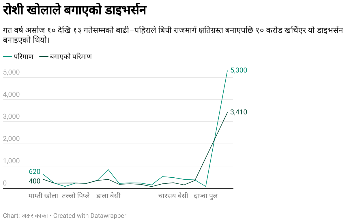 गत वर्ष असोज १० देखि १३ गतेसम्मको बाढी–पहिराले बिपी राजमार्ग क्षतिग्रस्त बनाएपछि १० करोड खर्चिएर यो डाइभर्सन बनाइएको थियो।