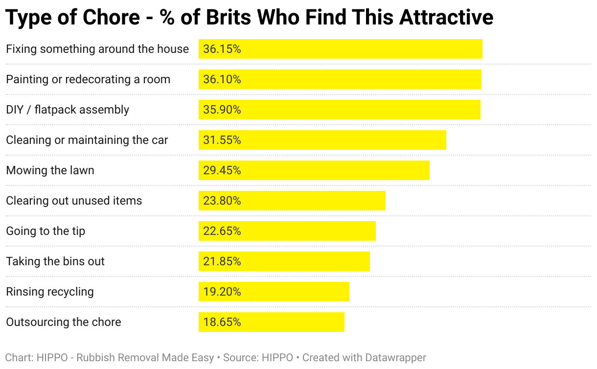 A chart displaying the percentage of Brits who find their partner sexually attractive when they do a particular chore. Fixing something around the house: 36.15%. Painting or redecorating a room: 36.10%. DIY / flatpack assembly: 35.90%. Cleaning or maintaining the car: 31.55%. Mowing the lawn: 29.45%. Clearing out unused items: 23.80%. Going to the tip: 22.65%. Taking the bins out: 21.85%. Rinsing recycling: 19.20%. Outsourcing the chore: 18.65%.
