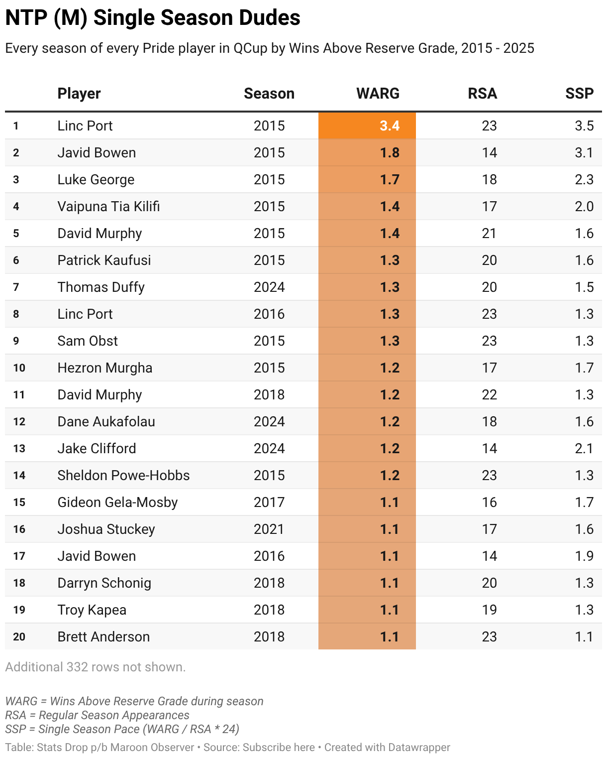 Every season of every Pride player in QCup by Wins Above Reserve Grade, 2015 - 2025